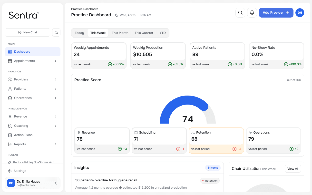 Sentra analyzes your practice data against industry benchmarks and shows you unscheduled treatment, broken appointments, and collection gaps.